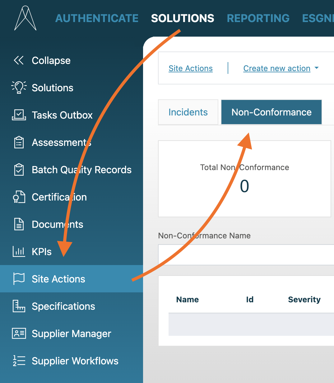 To create a Non-Conformance, From the 'Solutions' area select “Site Actions” from the left-hand menu. Once the page has loaded select the 'Non-Conformances' tab to view existing non-conformance or to create a new one select 'Create New Action' from the top menu and choose 'Create a Non-Conformance'.