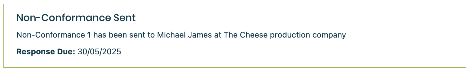 When you raise a non-conformance, emails will automatically be sent to notify the recipient selected. There will also be an e-mail sent to the assignees selected from your internal user list to notify them of the non-conformance.