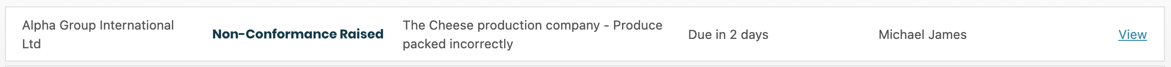 You can also access information on Non-conformance for a specific supplier on their profile page. On the suppliers’ company profile, all Non-Conformance will be shown with the current status provided. All users within your organisation can view all aspects of the Non-Conformance. (Only the creator of the non-conformance and assignees can add/amend data in a raised non-conformance) | |